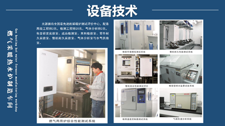 光源擁有全國最先進(jìn)的采暖爐測(cè)試評(píng)價(jià)中心,配備高級(jí)工程師2名,檢測(cè)工程師20名,氣體分析師2名,包含研發(fā)實(shí)驗(yàn)室、成品檢測(cè)室、來料檢驗(yàn)室、零件耐久實(shí)驗(yàn)室、整機(jī)耐久實(shí)驗(yàn)室、氣體分析室與水氣供給室。
