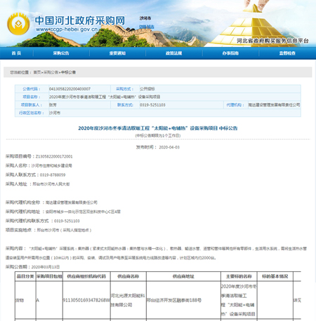 2020年度沙河市“太陽能+電輔熱”設(shè)備采購(gòu)項(xiàng)目中標(biāo)